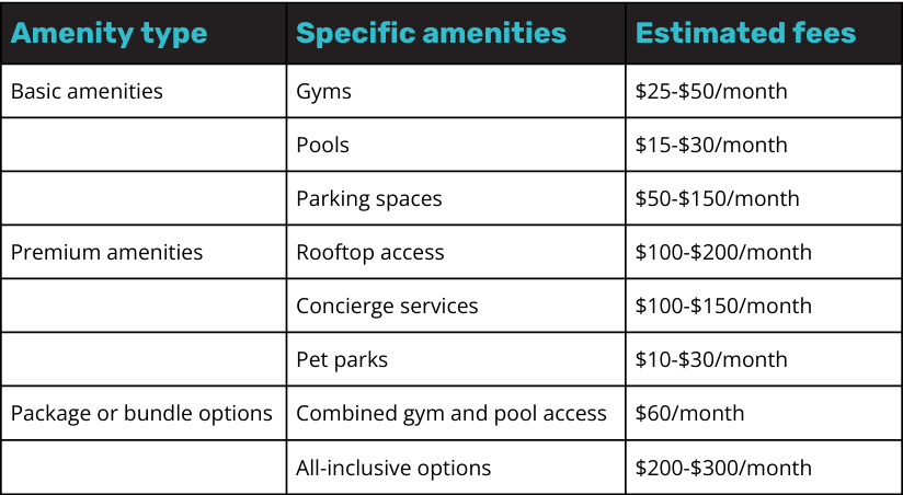 The table below outlines the typical fees for basic and premium amenities found in apartment and multifamily communities and package options offering additional value.