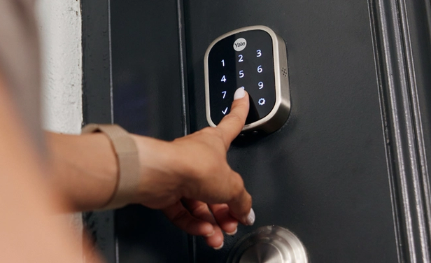 The Yale Assure Lever, electronic door lock, offers remote access, allowing property managers to grant entry to prospective renters, guests and maintenance workers via a mobile app.